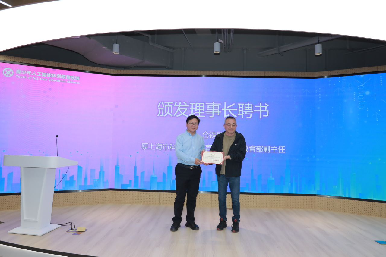 理事长仓铁肩先生为江省北大信息技术高等研究院智能教育实验室主任、研究员 肖艺能先生颁发联盟专家委员会主任聘书。