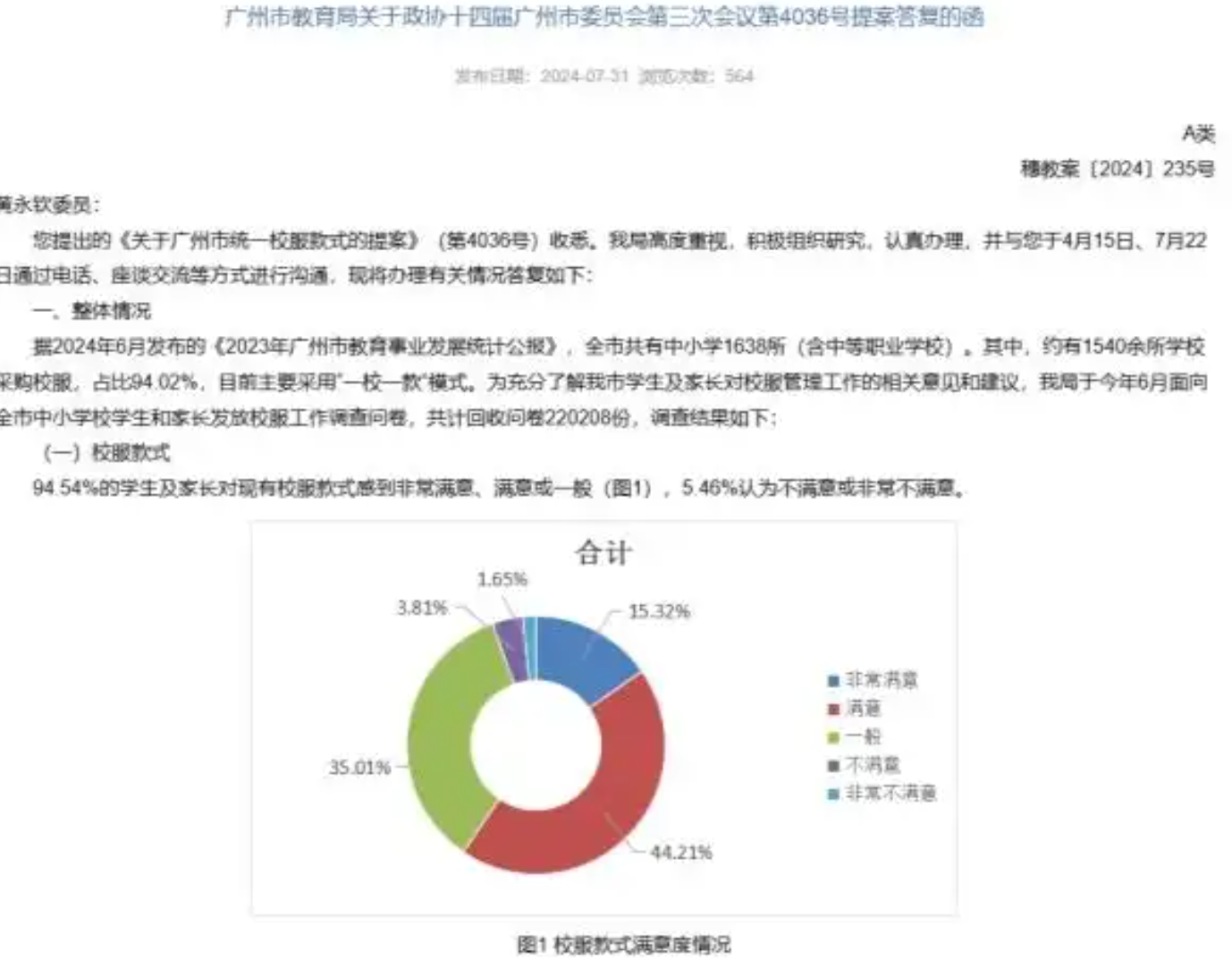 广州的校服治理实践,则为破解“一市一款”乱象提供了正面范本。2024年,广州市教育局开展覆盖全市的校服投票与满意度调研,回收有效问卷超22万份,调研过程全程公开透明,充分保障家长、学生的话语权与参与权;同时,广州始终坚持“一校一服”的个性化原则,由学校组织家委会、学生代表、专家组成采购评议小组,自主确定校服款式、选择合作企业,严格执行“双送检”制度,实现了校服质量安全、文化承载与家校认同的多重统一。调研结果显示,广州94.54%的学生及家长对校服款式表示认可,这一成果充分证明,尊重校园文化个性、保障家校深度参与、强化全链条质量监管,才是校服治理的科学路径。